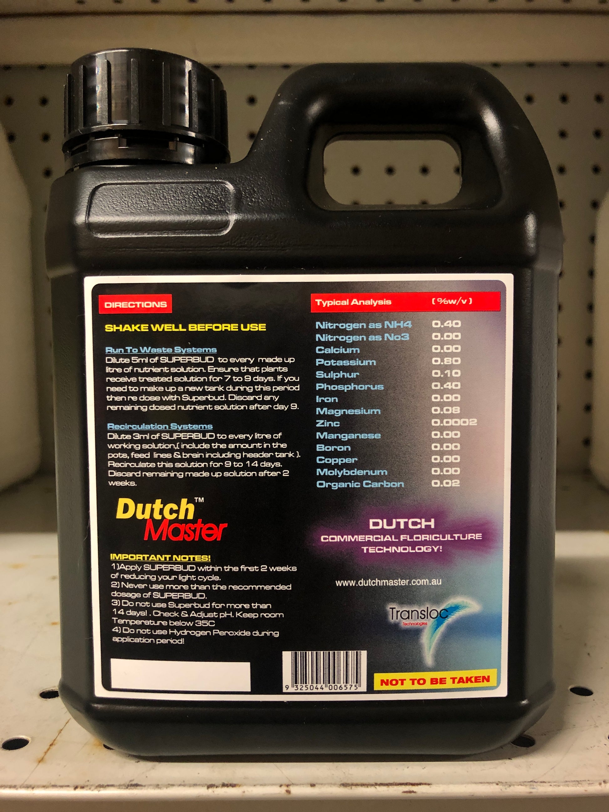 Superbud stops vertical plant growth and forces the plant to grow outwards and put on weight . Superbud Flowering Supplement can be used along side your other boosters and additives.